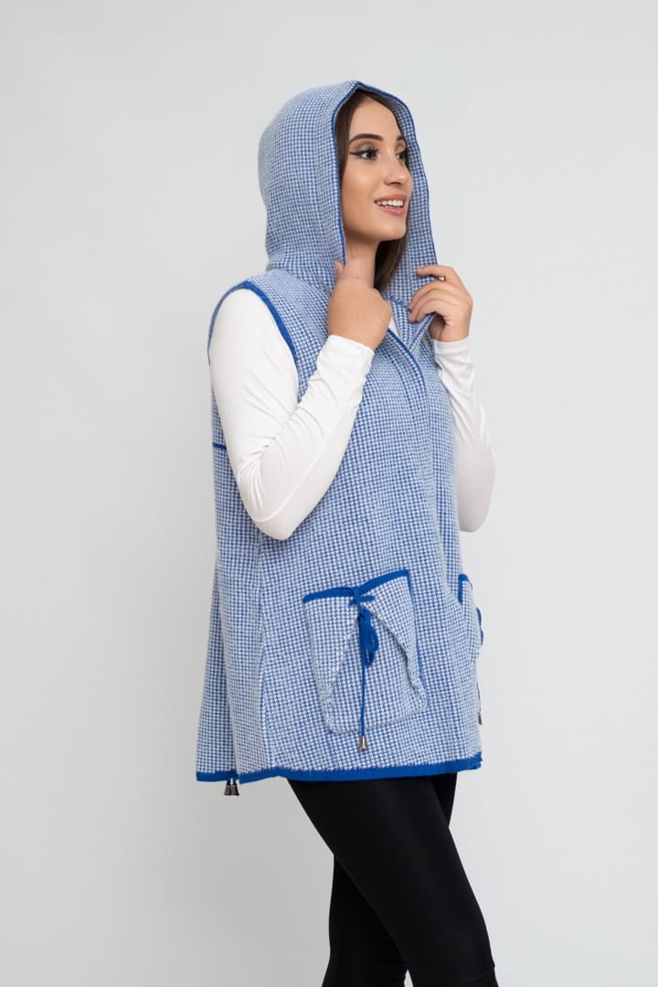 Şıklık ve konforu bir arada sunan kapüşonlu nokta desenli akrilik kadın yelek, modern kadının vazgeçilmez parçalarından biri! Yumuşak akrilik kumaşı sayesinde gün boyu rahatlık sunarken, zarif nokta desenleriyle tarzınıza feminen bir dokunuş katıyor.